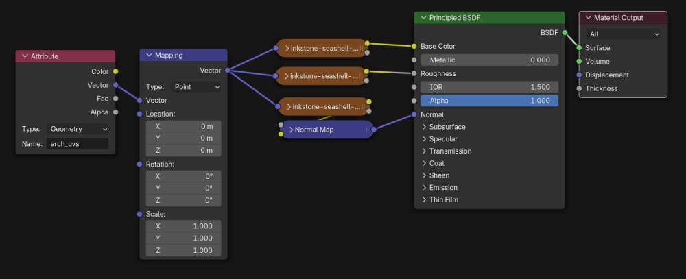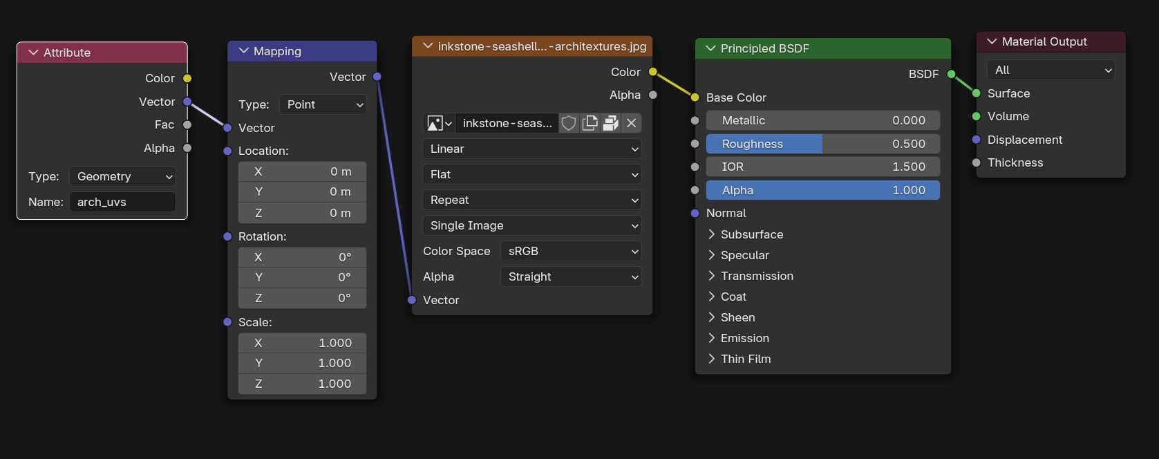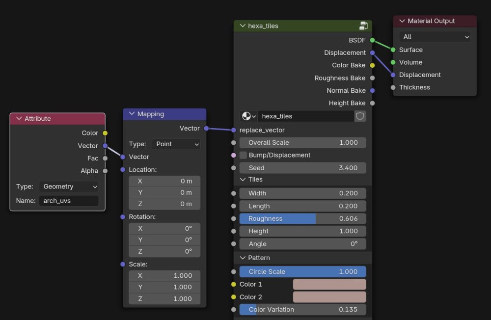 This single Attribute now serves as your Master UV Coordinate. You can connect it to multiple Image Texture Nodes (for PBR sets) or use it to drive any Procedural Material, guaranteeing perfect alignment and consistent scale across your entire architectural model.
