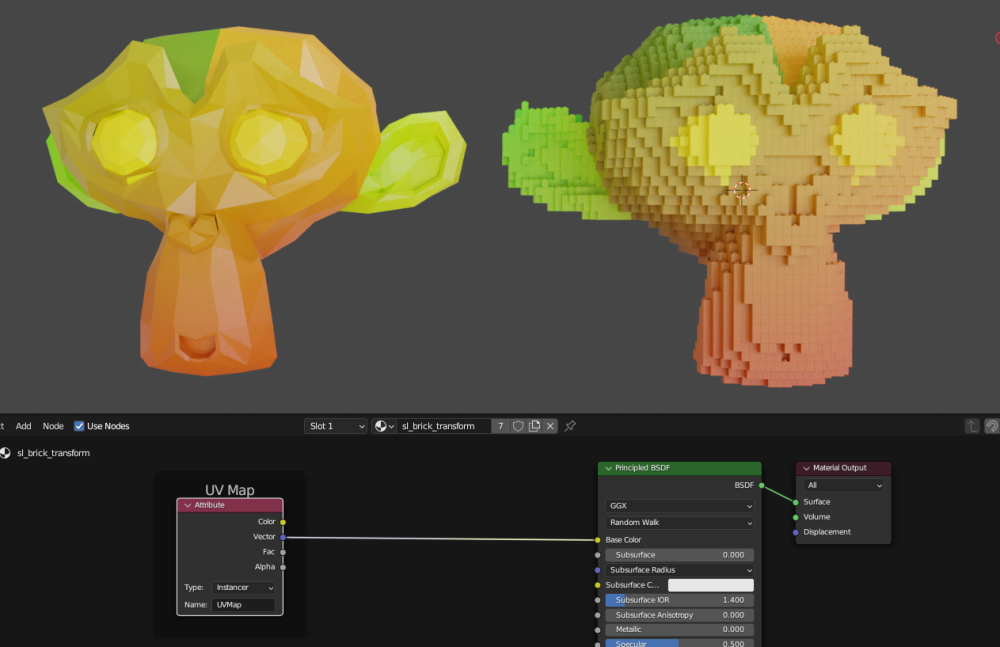 The effect applies a default material called “sl_brick_transform” with a white color, but the important part is that this material has an attribute that replicates the original object’s UVs.